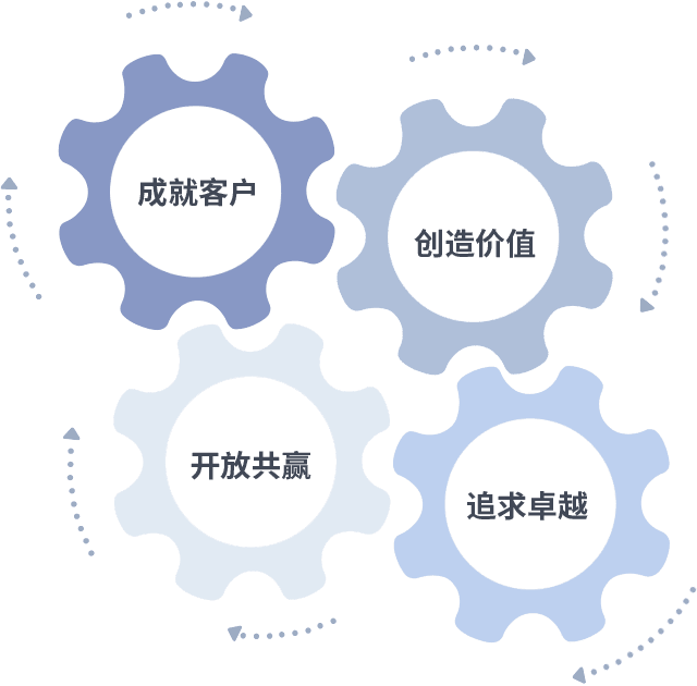 成就客户是一切决策的出发点,,创造价值是衡量所有工作的标准,,,,追求卓越是我们做事做人的态度,,开放共赢是我们的格局也是最终的结果。。价值观的齿轮环环相扣,,,推动着组织里的每个人不断向前。。